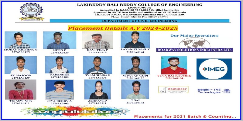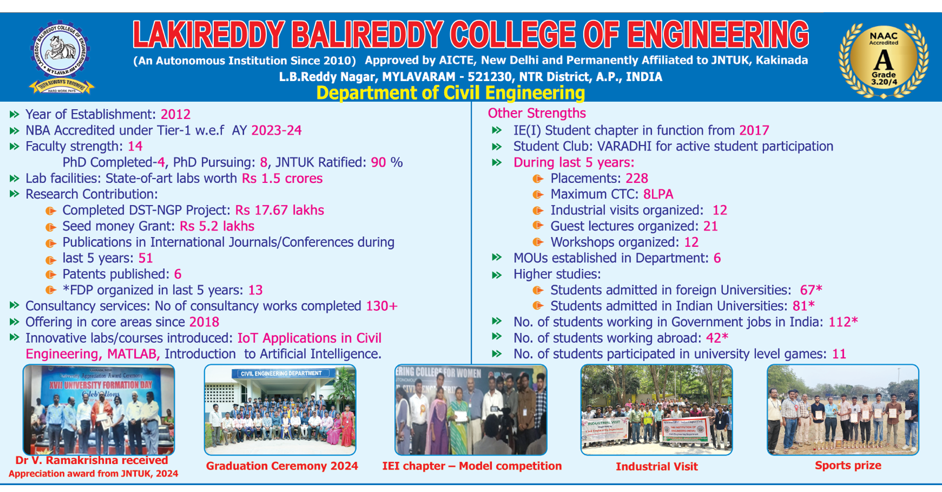 The Department of Civil Engineering was established in the year 2012, with B.Tech in Civil Engineering degree programme with an intake of 60 students. The department focuses on making the students strong in both technical and practical aspects to meet the national and international requirements. The department plans to establish interaction with industry for improving teaching research and consultancy aspects for continuous development of students, faculty and institution. It is a fast growing discipline in tune with high demands for infrastructure growth in particular due to current situation in the state of Andhra Pradesh. The department is well equipped with very good laboratory facilities for developing practical skills and fundamentals of students. The Department has several laboratories catering to the academic, research and consultancy requirements.