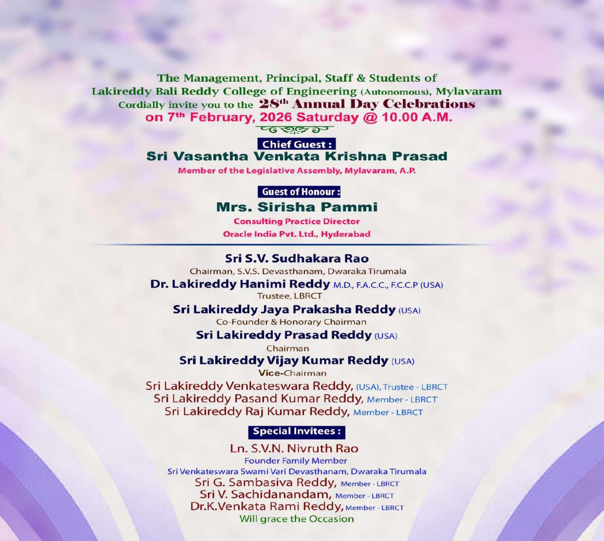 Lakireddy Bali Reddy College of Engineering (LBRCE) was founded through Lakireddy Bali Reddy Charitable Trust in 1998 by eminent philanthropist and NRI Entrepreneur Sri Lakireddy Bali Reddy, a Chemical Engineer by qualification. Since the inception, LBRCE aims at co-creating value-based technical excellence, which ultimately leads to the development of the rural area where the college is situated. (Read more...)