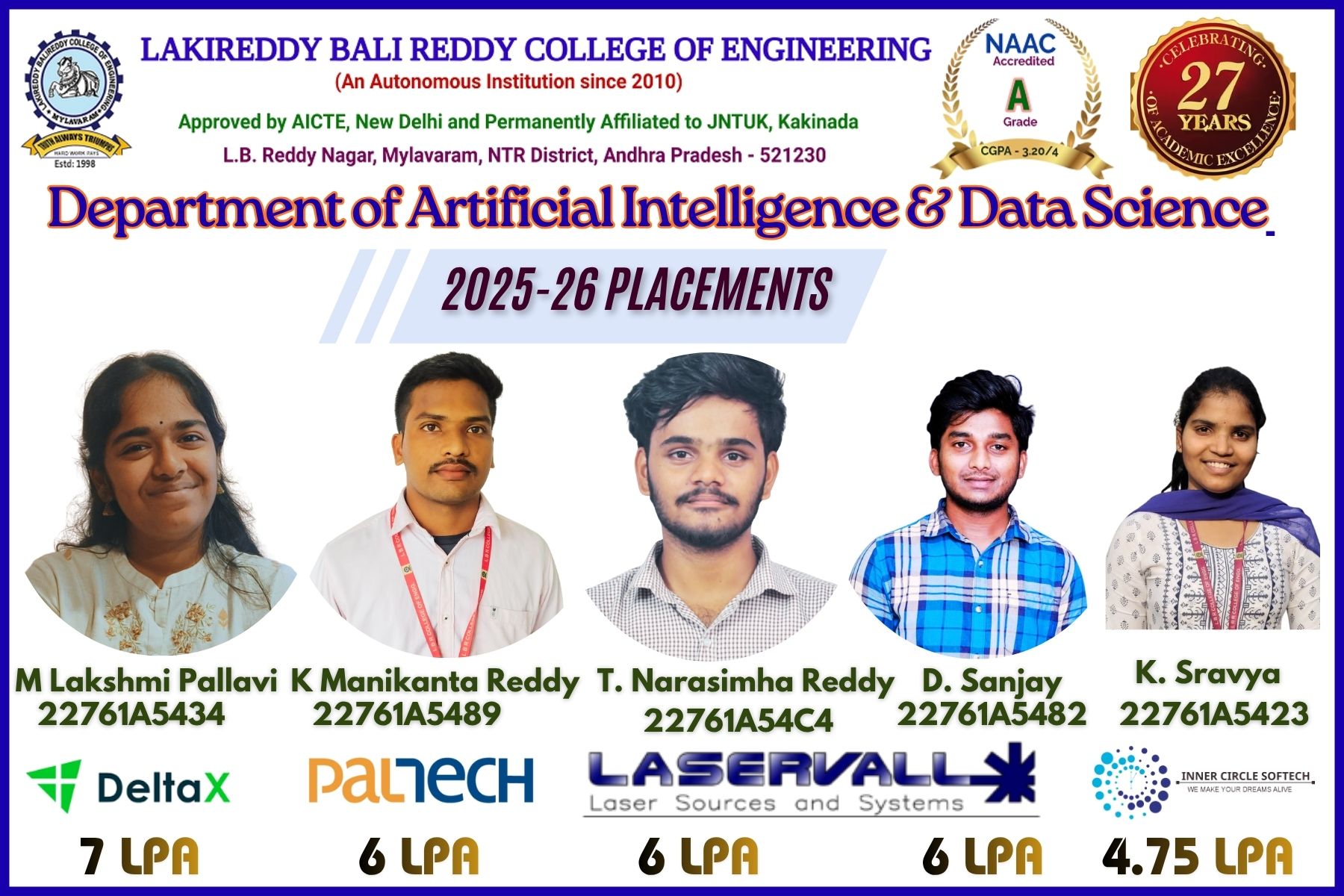 B. Tech. in Artificial Intelligence and Data Science (AI &DS) is an undergraduate programme with advanced learning solutions imparting knowledge of advanced innovations like artificial intelligence, data science, machine learning and deep learning. The main goal of artificial intelligence (AI) and data science (DS) is to program computers to use example data or experience to solve a given problem. This specialized B.Tech. course is specially designed to enable students to build intelligent machines, software, or applications with a cutting-edge combination of machine learning, analytics and visualization technologies. The Department of Artificial Intelligence & Data Science at the LBRCE was established in 2020 with an intake of 60 students and the intake was subsequently increased to 120 students in the year 2021.