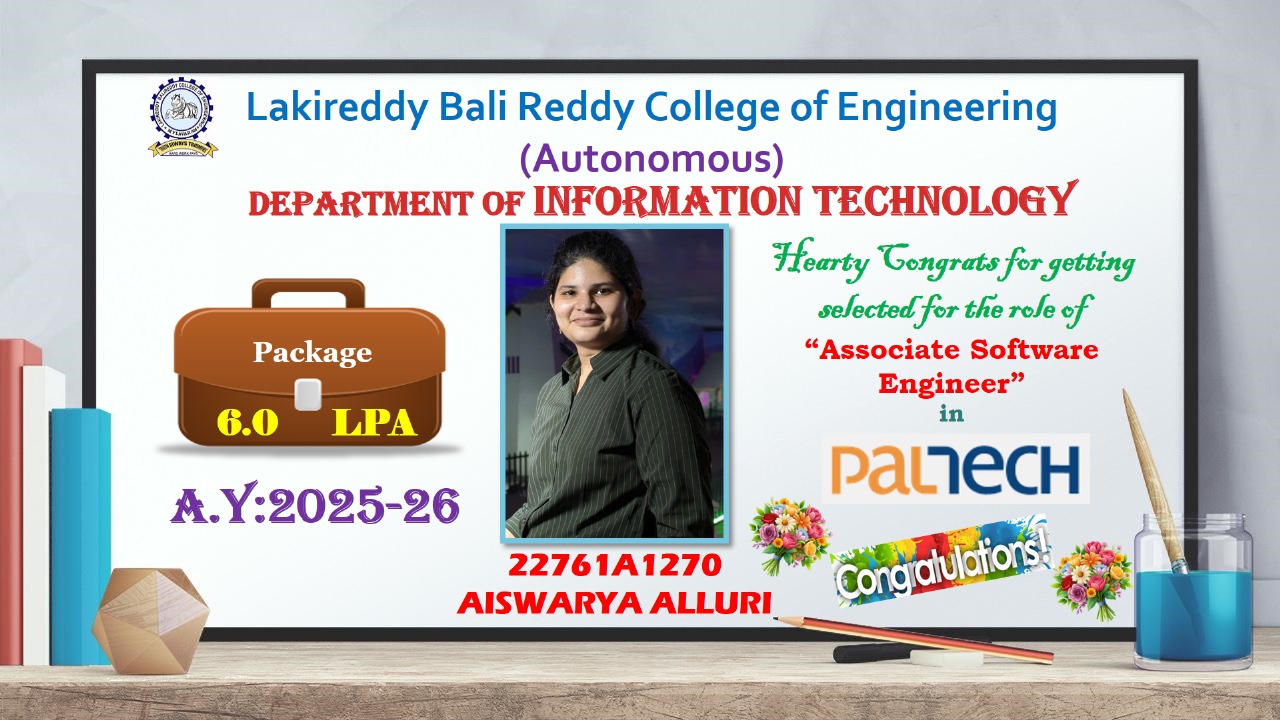 The Department of Information Technology at the LBRCE was established in 1999 offers Undergraduate program (B.Tech) in IT. The B.Tech (Information Technology) program was started in the year 1999 with an intake of 40 students. The intake was subsequently increased to 60 students in the year 2001, 120 students in the year 2019. Currently, our institute enabled high speed Internet bandwidth of 2090 Mbps. Since then, it has grown to be a center for excellence, innovation and research with dedicated faculty & staff, highly motivated students, state-of-the-art facilities and an innovative teaching-learning environment.