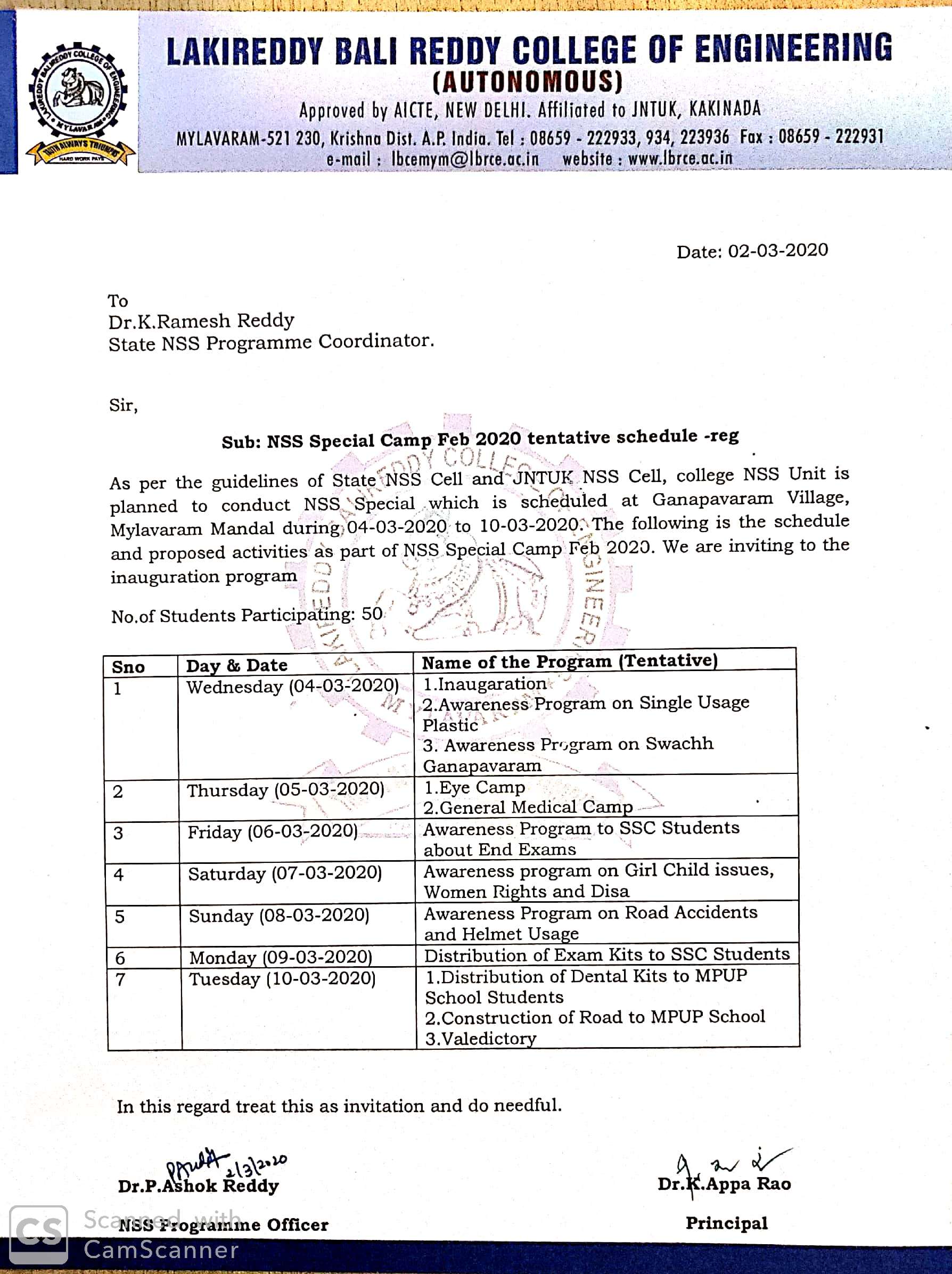 Participation of Students in State NSS Youth Festival | 25-02-2020 26-02-2020 | LBRCE Students | 2Students * 2days = 40 Hours | Click Here | |